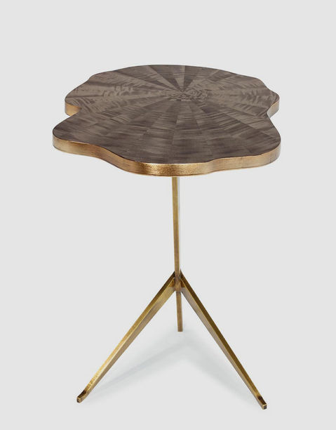 A very elegant gilt metal base contrasts with a sliced tree trunk imitation. The top has Defontes's signature by veneering it with an amazing frisé sycamore marquetry.